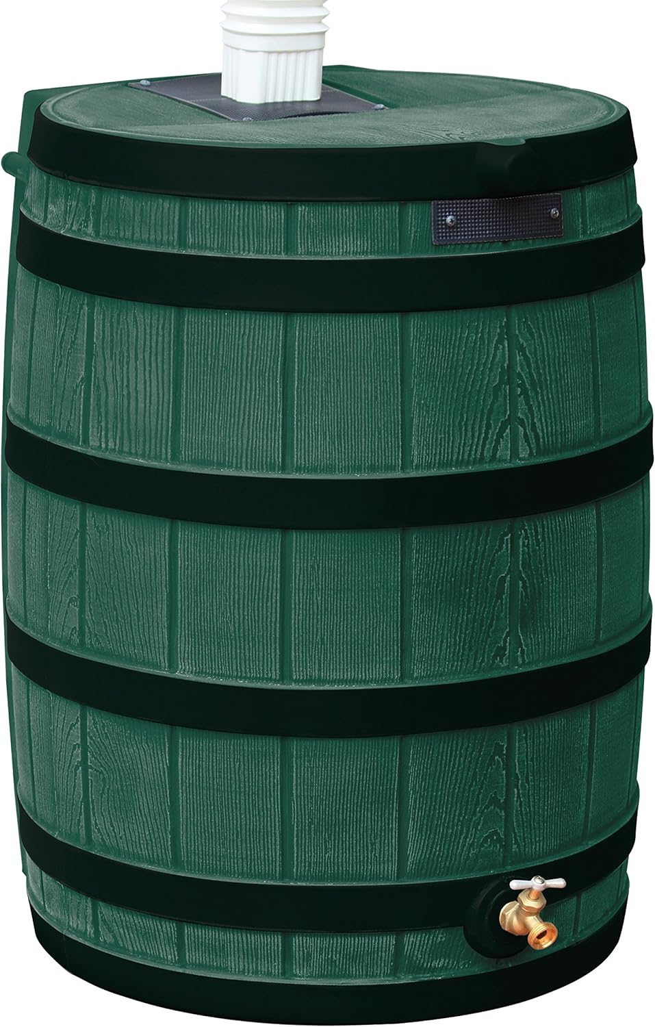 When drought sets in and rain is short, rain barrels can provide that precious water you need for your lawn and garden. The Rain Vault can provide up to 50 gallons of pure, unchlorinated water when municipalities declare periods of low water usage. During heavy rain falls, a typical roof can produce hundreds of gallons of water. By saving that water, you can reduce your average water usage by up to 40-Percent. With those kinds of savings, the Rain Vault can pay for itself in just a few seasons.The Rain Vault features an attractive faux oak barrel design so it naturally fits in with your landscape. And the wide variety of colors allows you to even further match your barrel to your home and yard without standing out. Its plastic screen mesh is newly designed to keep out bugs, animals, and debris while still being easy to remove for cleaning and maintenance and is gentle on skin. A front side overflow keeps water from flooding against your outside wall. The flat-back design is one of the most convenient features as it allows your barrel to sit right up against your home so you don't have to worry about purchasing excess downspout parts.These barrels are tough. While most barrels will crack or become brittle in the winter time, the Rain Vault will stay strong. It is still recommended that you drain your barrels when temperatures approach the freezing point. And if you're looking for the best deal for the planet, be sure to get a Rain Vault. These barrels are made of 100-Percent recycled resin.