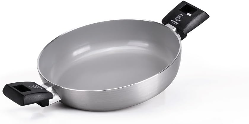 100% recycled aluminium body from cans suitable for contact with food. Finegres innovative natural non-stick coating (NO PFAS), free from PTFE, PFOA, NICKEL and heavy metals. It is resistant to scratches and heavy use. Today with a new, more non-stick formula. Brushed aluminium outer shell with tarnish and scratch protection. Induction base "Net Induction": suitable for all types of burners including induction. Packaging 100% Plastic free, 100% Made in Italy.