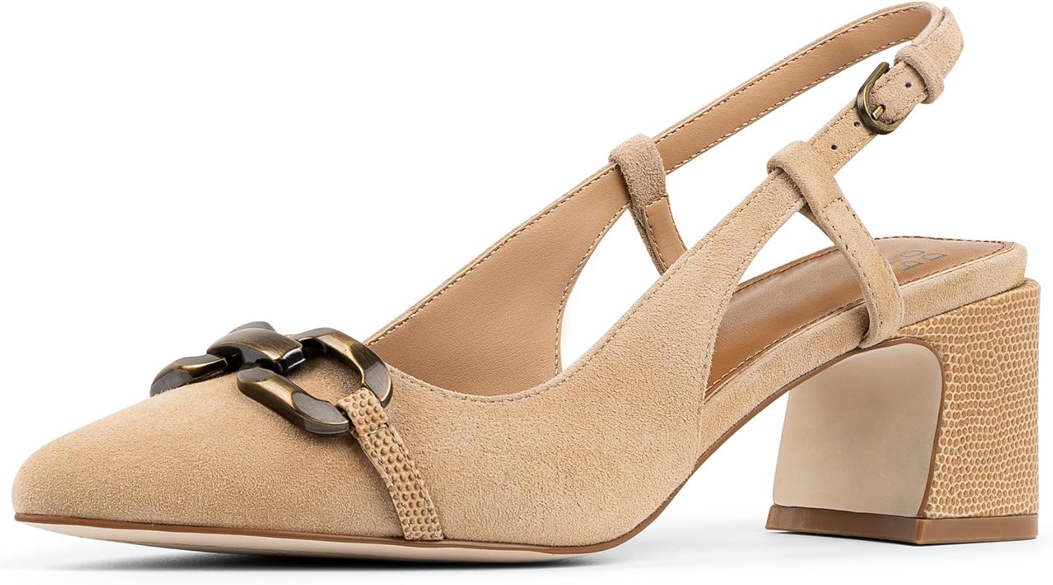 The VARYA slingback pump combines a pointed toe and block heel for a structured, modern look. The adjustable buckle ensures a secure fit, while the ornamented upper adds a unique detail to this standout style. Designed with a memory foam padded insole, it offers comfort without compromising on elegance.